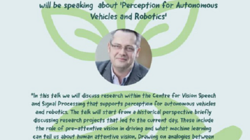 Abstract: In this talk we will discuss research within the Centre for Vision Speech and Signal Processing that supports perception for autonomous vehicles and robotics. The talk will start from a historical perspective briefly discussing research projects that led to the current day. These include the role of pre-attentive vision in driving and what machine learning can tell us about human attentive vision. Drawing on analogies between humans and machines, we will also look at the use of semantic cues in robot localisation. The talk will then discuss work into autonomous localisation in GPS denied areas using vision alone. Finally, the talk will present approaches to estimating the sematic layout of a scene from a single camera and the relationship of this work to monocular depth estimation.